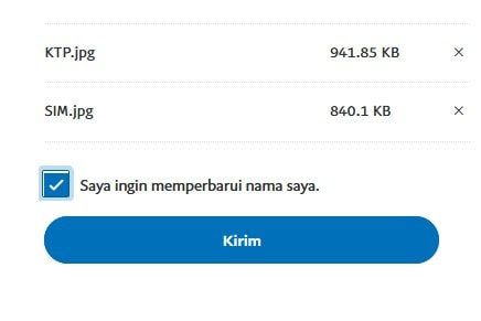 5. Setelah upload KTP dan SIM. Centang “Saya ingin memperbarui nama saya.” lalu klik Kirim.