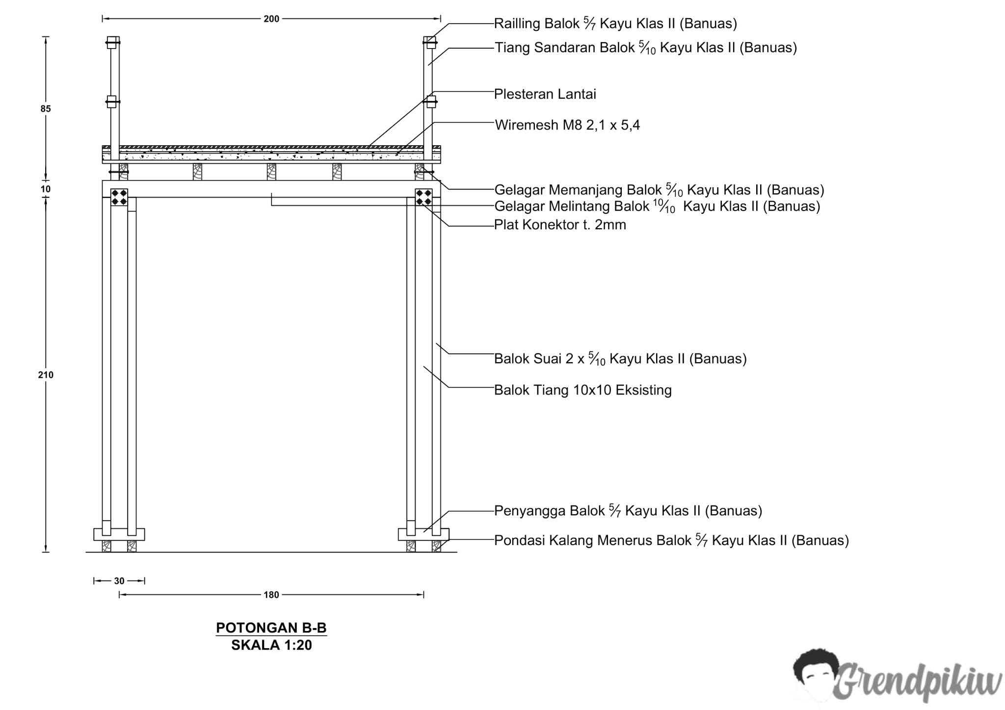 Desain jembatannya make struktur komposit kayu-beton, yang terdiri dari beberapa komponen. Balok kayu sebagai gelagar, papan kayu yang sekaligus jadi bekisting mati dan plat lantai beton bertulang (tulangannya saya pakai wiremesh). Untuk struktur bawahnya, ditambahkan pondasi kalang menerus di sisi kiri-kanan tiang eksisting, sebagai daya dukung tiangnya biar gak nyerocos kebawah gara-gara adanya tambahan beban dari beton bertulang.